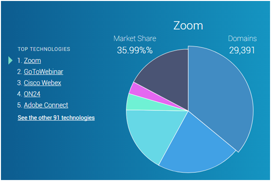 但是,Zoom是一匹杀入这片红海市场的强劲黑马。据技术制图服务提供商Datanyze,目前全球共有96家公司从事网络会议服务提供,其中Zoom以35.99%的市占率高居榜首,Webex以17.33%的市场份额位居第三。此外,在Owl Lab发布的《2018年视讯会议市场报告》中,受访者中使用Zoom的人数仍然位居第一,占比25%,其次是Skype for Business。