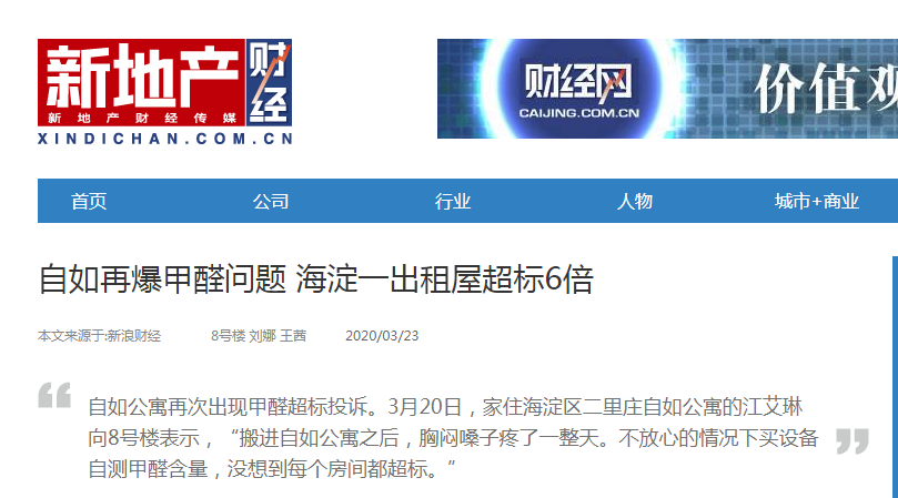 再往前推至今年3月23日。据当天《财经网》刊发的报道说:2月20日,家住海淀区二里庄自如公寓的江艾琳向8号楼表示,“搬进自如公寓之后,胸闷嗓子疼了一整天。不放心的情况下买设备自测甲醛含量,没想到每个房间都超标。”
