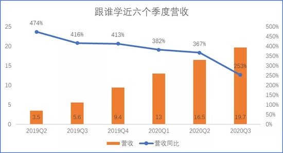 不过,跟谁学的营收增速近六个季度以来在持续降低。而跟谁学在二季报中也预计2020年Q3收入19.36-19.66亿元,增长247.6%-253%,这意味着三季度营收增速将出现明显下滑趋势。