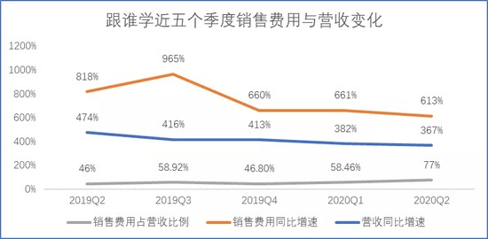 一般来说,销售费用占比的高低体现了企业效益的好坏。销售费用占营收比例率越低,企业的效率就越好。从上图可看出,跟谁学的近一年的营销费用率总体上呈现增长趋势,2020年二季度的占比从一季度的58.46%增长至77%。