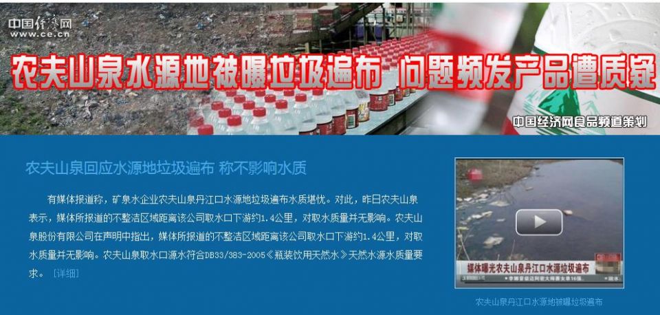 更早之前,农夫山泉取水点周边水域疑似严重污染的消息也被传的沸沸扬扬。