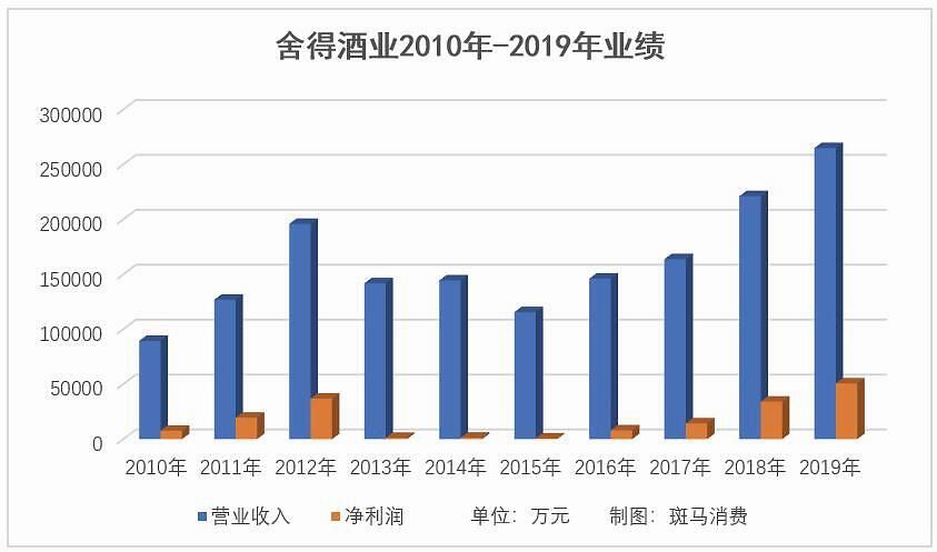 2013年-2015年,舍得酒业营业收入分别为14.19亿元、14.49亿元、11.56亿元,净利润分别为1177万元、1319万元、713万元,此后几年迅速提振:2019年,公司营业收入、净利润分别为26.50亿元、5.08亿元。