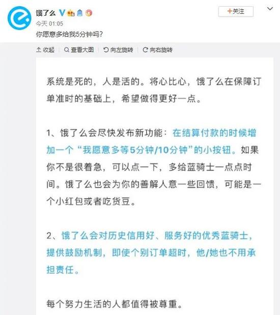 9月9日凌晨,饿了么发出《你愿意多给我5分钟吗》声明,表示将会尽快发布一个新功能,“在结算付款的时候增加一个‘我愿意多等5分钟/10分钟’的小按钮,如果消费者不是很着急,可以点一下,多给蓝骑士一点时间。饿了么也会为你的善解人意一些回馈,可能是一个小红包或者吃货豆。”