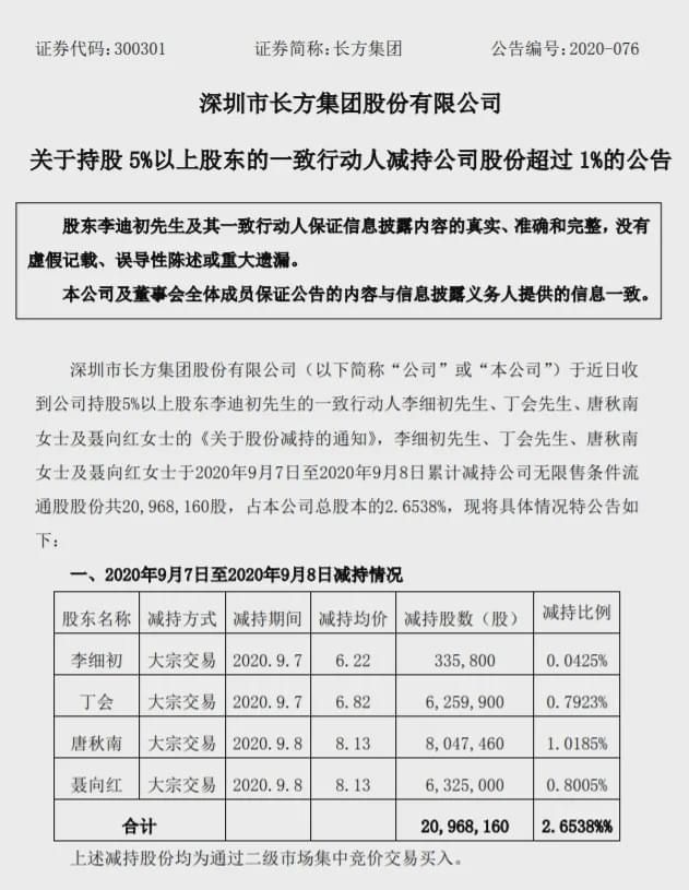 长方集团公告,李细初等多名股东于9月7日-8日累计减持公司2096.8万股,占本公司总股本的2.6538%。长方集团9日停牌,此前收获五连板。