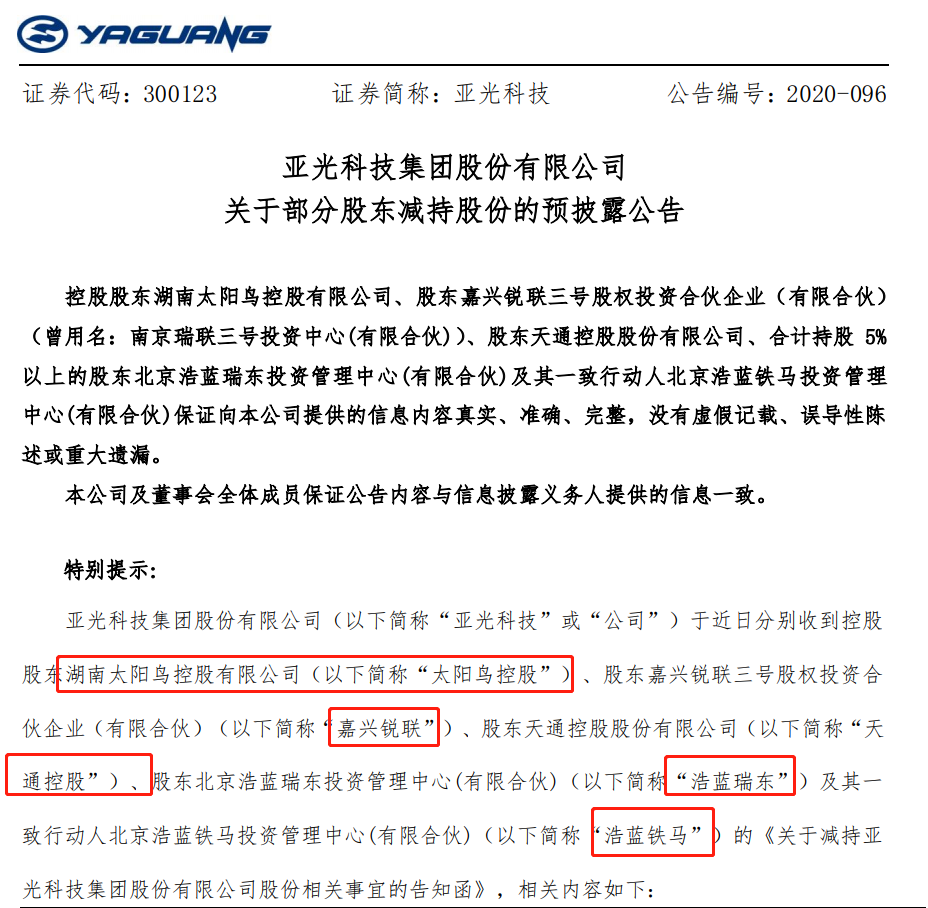 太阳鸟控股拟减持的股份来源为通过非公开发行方式(发行股份购买资产)取得的股份且已解除限售条件的公司股份,和首次公开发行股票上市前持有的亚光科技股份(含该等股份因资本公积金转增股本而相应增加的股份);嘉兴锐联、天通股份、浩蓝瑞东及浩蓝铁马拟减持的股份来源为上市公司重大资产重组发行的非公开发行股份。