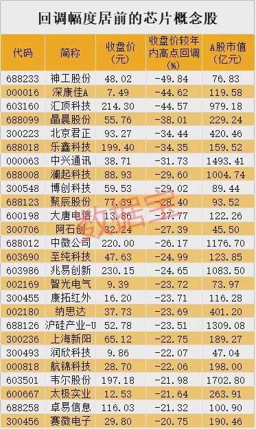 不过近期多数芯片概念股都处于调整态势,数据宝统计显示,与年内高点相比,有26只芯片概念股回调幅度超过20%。神工股份、深康佳A、汇顶科技、晶晨股份、北京君正等回调幅度排在前五位,其中神工股份回调幅度49.84%居首,该公司是国内领先的集成电路刻蚀用单晶硅材料供应商,上市首日便冲高回落,之后震荡调整至今。身兼华为概念、无线耳机、芯片、人工智能等多重题材的汇顶科技已回调44.57%,最新A股市值已不足千亿元。