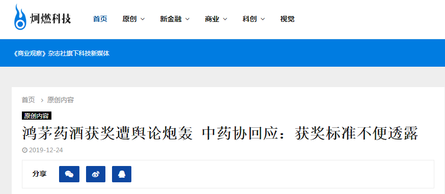 在此之前,2019年12月24日,《炣燃科技》首家刊发《鸿茅药酒获奖遭舆论炮轰 中药协回应:获奖标准不便透露》文章,披露了备受质疑的鸿茅药酒竟被鸿授予“2018年度履行社会责任明星企业”荣誉称号。而其公司总裁鲍东奇则“拿下2018年度履行社会责任年度人物奖”。