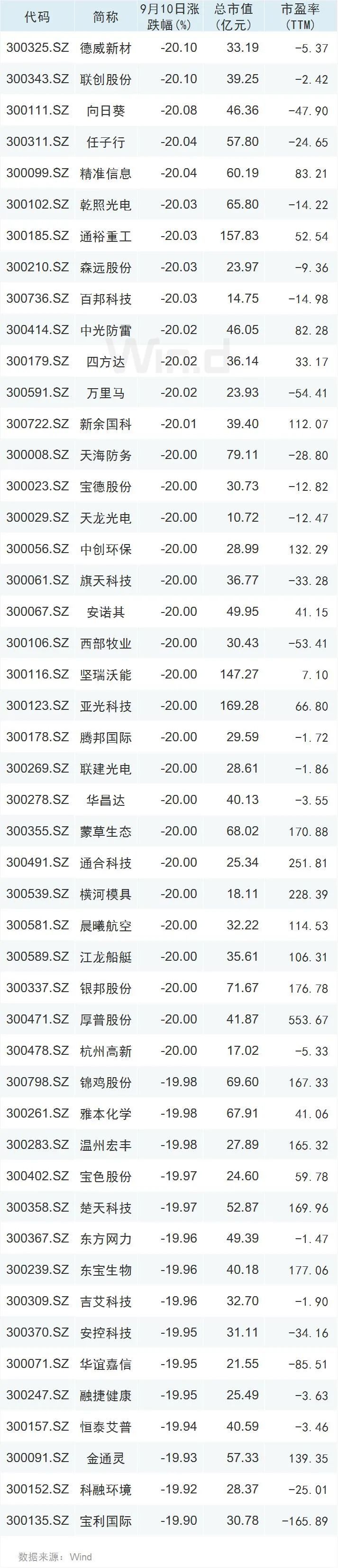 截至9月10日收盘,有德威新材、联创股份、向日葵、任子行、精准信息、乾照光电、通裕重工、森远股份、百邦科技、中光防雷、四方达、万里马等48家公司跌停。
