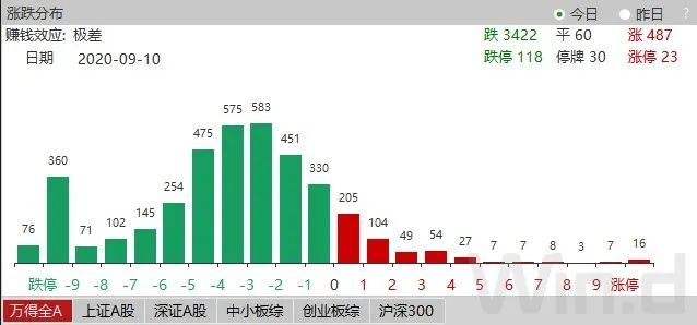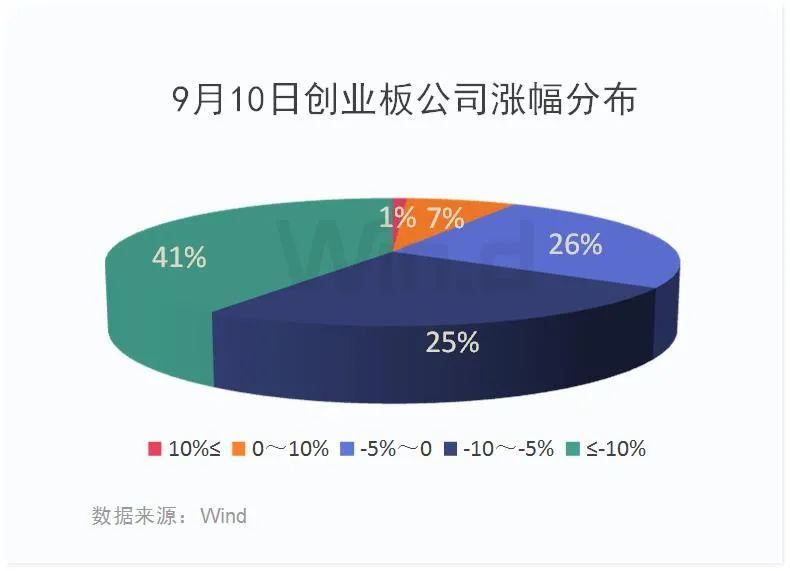 从9月10日全部创业板公司涨幅来看,涨幅10%≤的有8家,占比1%;涨幅在0~10%的有61家,占比7%;涨幅在-5%~0的有217家,占比26%;涨幅在-10~-5%的有213家,占比25%;涨幅≤-10%的有343家,占比41%。若按老的交易规则10%涨跌幅来看,创业板有超过4成公司跌停。(剔除新股及停牌股)
