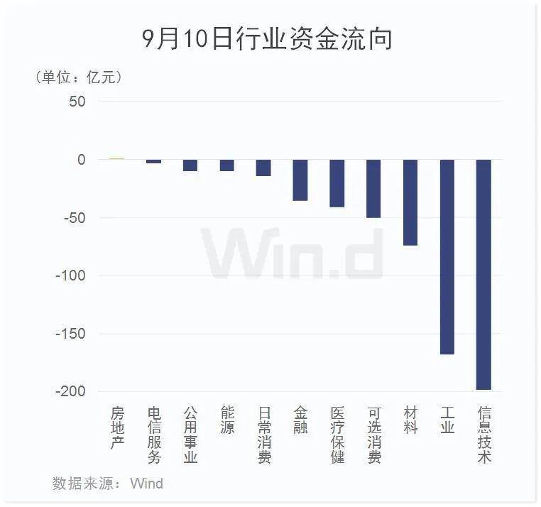从9月10日行业资金流向来看,累计净流出600多亿元,除房地产板块主力资金微幅净流入外,其余板块全部净流出。其中,信息技术板块净流出金额约200亿元,位居首位;工业板块净流出金额超过160亿元,紧随其后。此外,材料、可选消费板块净流出金额亦较多。