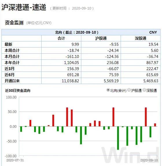 9月10日,北上资金净流入9.99亿元,本周仍净流出18.74亿元,且从近期资金流向来看,北上资金大幅净流出的天数明显多于净流入的天数。