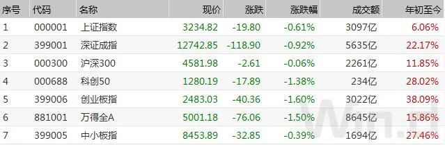 9月10日,沪深两市小幅下跌,截至收盘,上证指数跌0.61%报收于3234.82点;深成指跌0.92%报收于12742.85点;创业板指跌1.60%报收于2483.03点,万得全A总成交8600多亿元。