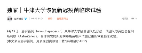 9 月 12 日,据报道,阿斯利康公司该款疫苗的临床试验重启。