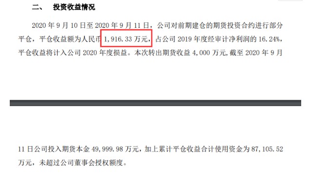 秦安股份9月11日晚公告称,9月10日至9月11日,公司对前期建仓的期货投资合约进行部分平仓,平仓收益额为1916.33万元,占公司2019年度经审计净利润的16.24%。