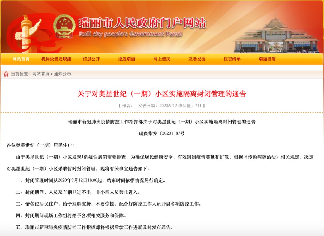 9月12日晚,云南省瑞丽市新冠肺炎疫情防控工作指挥部在市政府官网上连续发布两则通告,称当地发现1例疑似病例。