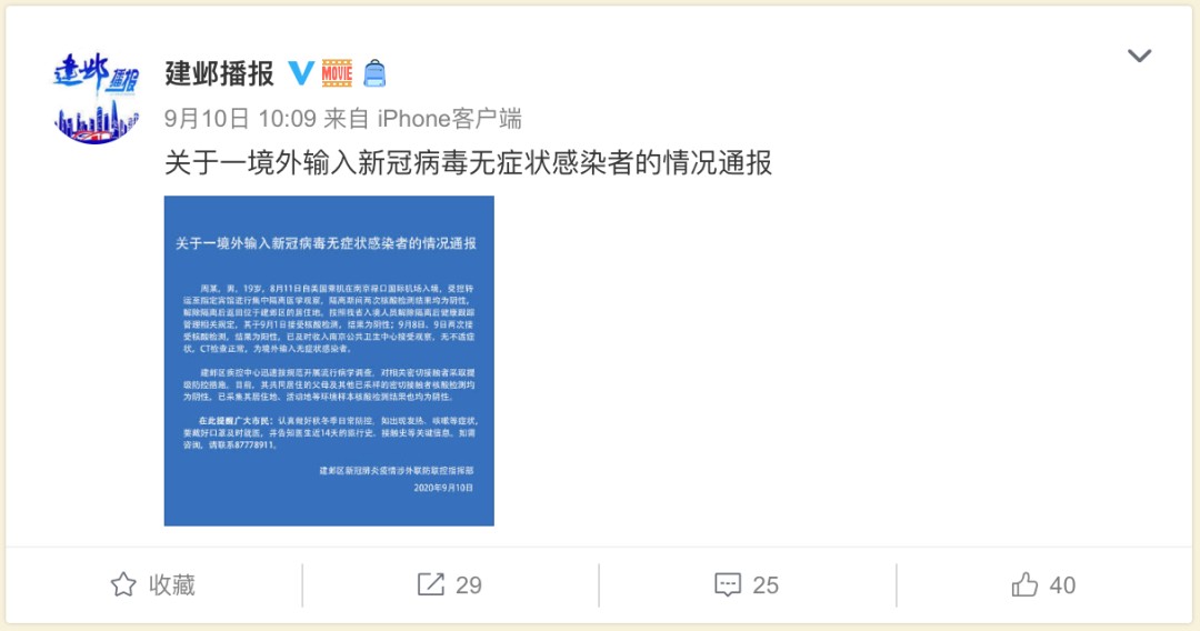 按照江苏省入境人员解除隔离后健康跟踪管理相关规定,其于9月1日接受核酸检测,结果为阴性;9月8日、9日两次接受核酸检测,结果为阳性,已及时收入南京公共卫生中心接受观察,无不适症状,CT检查正常,血清学抗体(IgM、IgG)检测为阳性,无发热、咳嗽等临床症状,为境外输入无症状感染者。