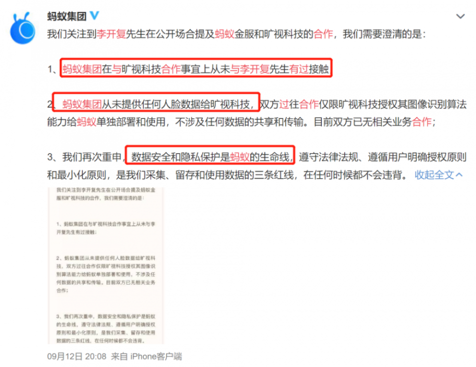 9 月 12 日晚上 8 点,蚂蚁集团就率先发出声明。
