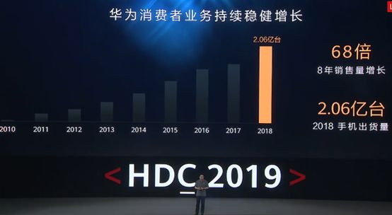 据余承东介绍,过去八年,华为消费者业务销售量增长68倍,2018年手机出货量2.06亿台。