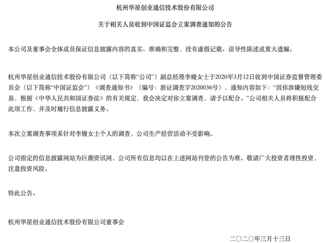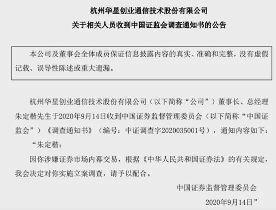 9月14日晚间,杭州华星创业通信技术股份有限公司(简称“华星创业”)发布公告称,公司董事长、总经理朱定楷当日收到中国证监会的《调查通知书》。通知书显示,朱定楷因涉嫌证券市场内幕交易,证监会决定对其实施立案调查。公告表示,公司相关人员将积极配合此项工作,并及时履行信息披露义务。本次立案调查事项系针对朱定楷个人的调查,公司生产经营活动暂不受影响。