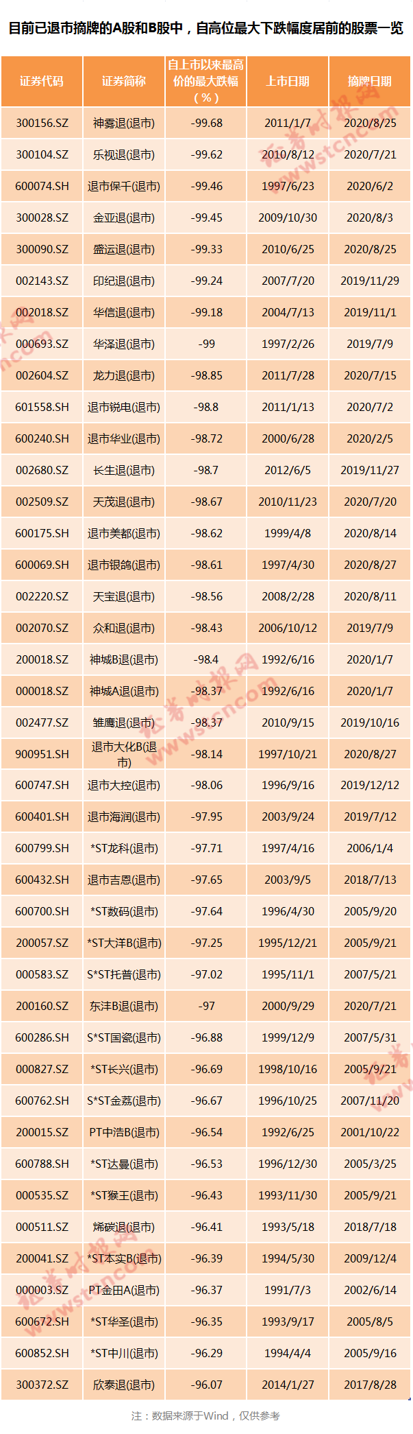 数据显示,2019年以来退市摘牌的股票中,绝大多数自高位的最大跌幅都超过了98%。而最近几只摘牌的退市股中,多只跌幅超过了99%,比如保千里、金亚科技、盛运环保、乐视网、神雾环保。