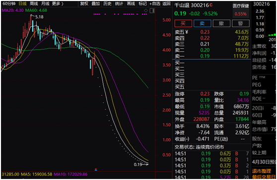 行情数据显示,千山药机14日股价再一次封住跌停,股价仅报0.19元,创下历史新低。在考虑权息因素后,该股自历史最高价已跌去99.75%,创下A股史上最大下跌纪录!