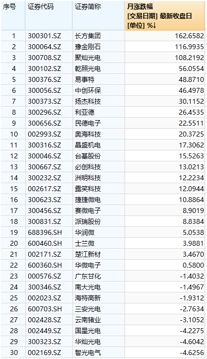 若将时间线拉长,本月初至今,第三代半导体相关概念股股价整体呈上涨趋势,其中长方集团、豫金刚石、聚灿光电均涨超一倍。
