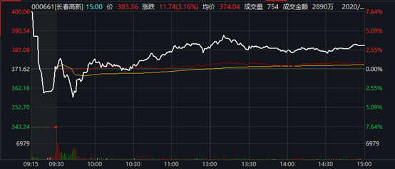 有多名业内人士认为,长春高新选择在这时发布三季报业绩预告,大概率是为了消除市场顾虑,稳定公司股价。9月15日,长春高新高开低走,开盘时股价曾一度接近400元/股,随后后大幅回落。截至收盘,该股报收于383.36元/股,涨幅3.16%。
