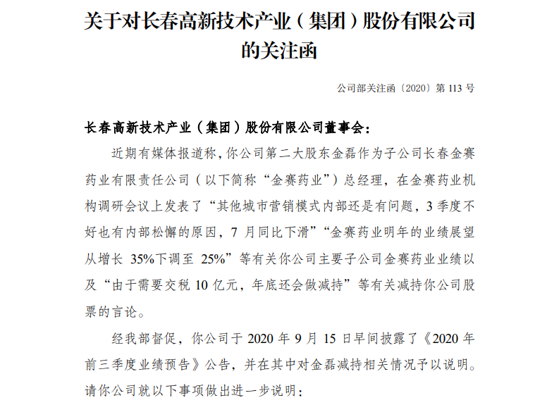 9月15日晚间,长春高新技术产业(集团)股份有限公司(下称“长春高新”)收到深交所关注函。深交所要求其结合金赛药业历史业绩情况,说明市场能否通过金赛药业业绩直接推断上市公司业绩的情况。同时,还要求上市公司说明金磊关于公司业绩相关言论是否属实。