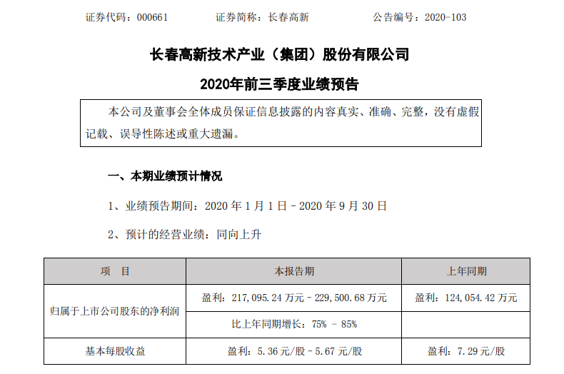 经历爆冷跌停之后,9月15日长春高新发布三季报业绩预告。预计今年前三季度预计盈利21.71亿元-22.95亿元,同比增长75%-85%,基本每股收益5.36元/股–5.67元/股。
