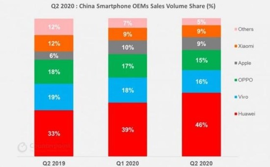 苹果的中国区市场份额较今年Q1也有所下滑。据市场调研机构Counterpoint发布的2020年Q2国内手机市场最新的出货份额显示,华为占比46%,vivo占比16%,OPPO占比15%,苹果占比9%,小米占比9%。