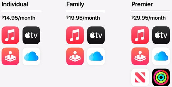 本持着这一原则,此次发布会推出了“苹果服务全家桶套餐”Apple One,包含Apple Fitness+、iCloud、Apple Music、Apple TV+、Apple Arcade(游戏订阅服务)、Apple News+等产品,并包含三个付费方案。
