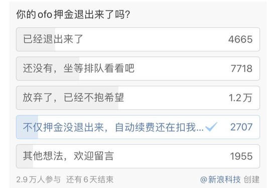 一项微博投票显示,大部分网友的ofo押金还未退还。