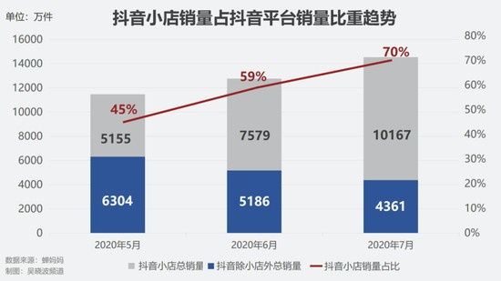 据蝉妈妈(抖音电商数据分析平台)数据,2020年5-7月,抖音小店销量占抖音全平台销量分别达到45%、59%、70%,均保持10%以上的增速。