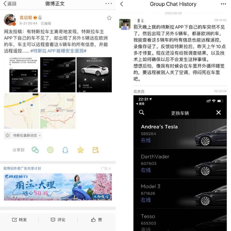 8月21日,微博汽车博主@袁启聪发文称,收到一位网友投稿,8月18日晚,这名网友的特斯拉App打开后找不到自己的车辆,却出现了另外5辆车,自己能查看这5辆车的所有信息也能远程遥控。且这5辆车显示的定位均在欧洲。