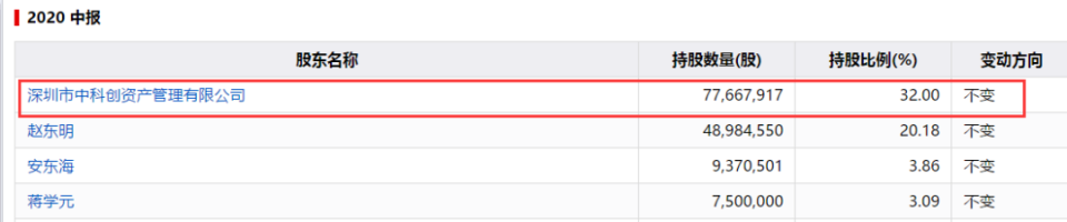 根据ST中科创的中报显示,截至2020年6月30日,深圳市中科创资产管理有限公司仍持有该公司7700多万股,持股比例32%,仍为第一大股东。
