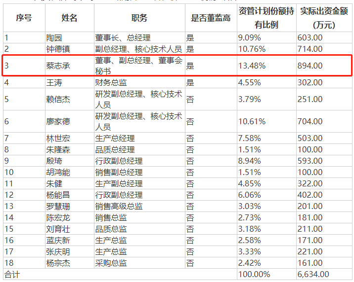 具体来看,公司董事长、董事、财务总监等高管,核心技术人员以及生产总经理、品质总经理等中层干部,均通过员工资管计划搭上了这列“财富快车”。