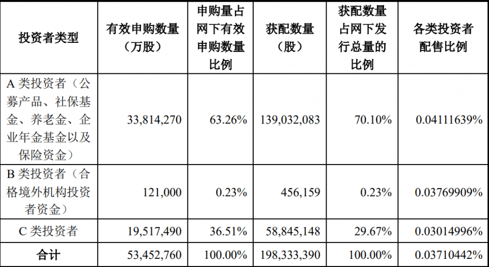 根据公司披露的网下配售结果,311家网下投资者共申购了5345.28万股,其中,公募、社保、养老金、企业年金基金以及保险资金构成的A类投资者占比最高。