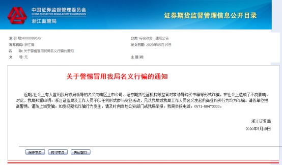 值得注意的是,今年5月,甚至连浙江证监局都遇到了冒名顶替的诈骗分子。