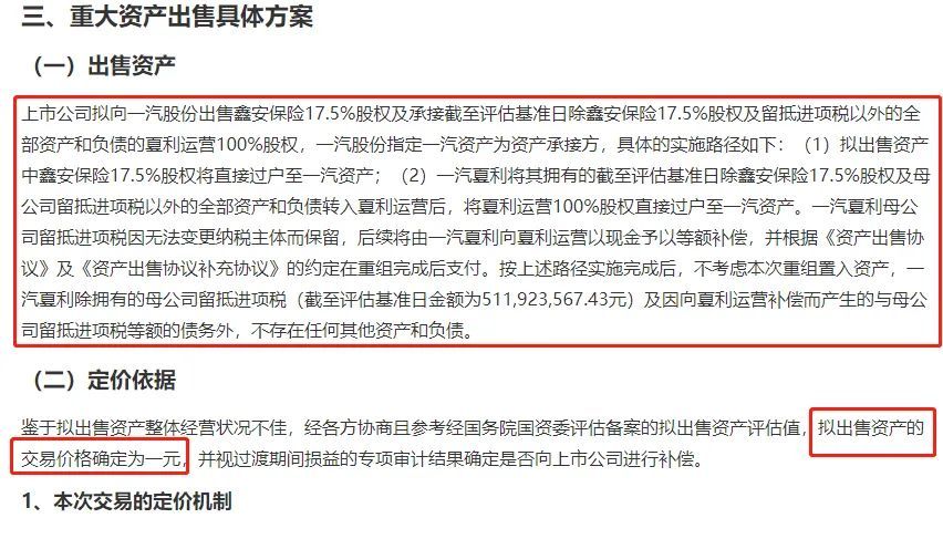 当然,对于为何只卖1元,也是有说法的,因为夏利汽车连年亏损,经营不佳啊,净资产为负的好多个亿。公告表示,鉴于拟出售资产整体经营状况不佳,经各方协商且参考上述评估值,拟出售资产的交易价格确定为1元,由一汽股份指定资产承接方向一汽夏利直接支付,并视过渡期损益的专项审计结果确定是否向一汽夏利进行补偿。