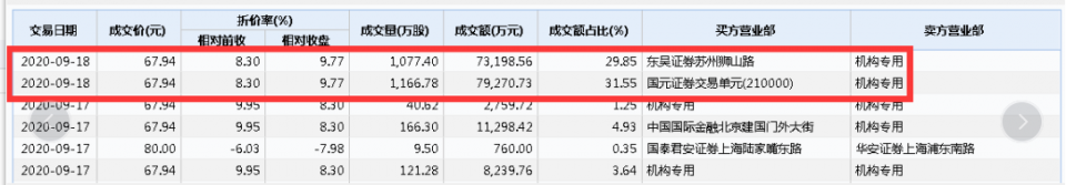 另1笔成交价格也是67.94元,成交1,077.40万股,成交金额73,198.56万元,买方营业部为东吴证券股份有限公司苏州狮山路营业部。