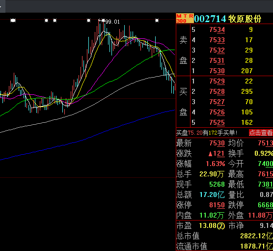 持续下跌的“猪中茅台”牧原股份在9月18日迎来反弹,截至当日牧原股份报75.30元/股,上涨1.63%。