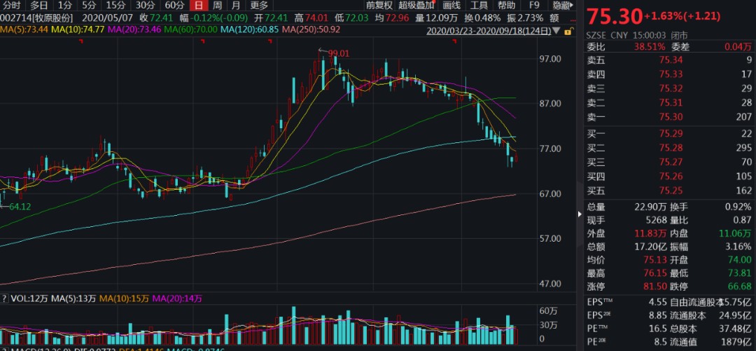 7月中旬以来,牧原股份股价从盘中最高的99.01元每股已经下跌到了75.30元每股,跌幅接近25%,无论是从产业逻辑上,还是整体市场环境上,牧原股份似乎都到了一个微妙的关口。