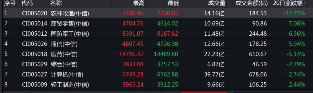 另一面,农林牧渔板块同期跌幅高达12.75%,通信、医药等板块跌幅也都超过5%。
