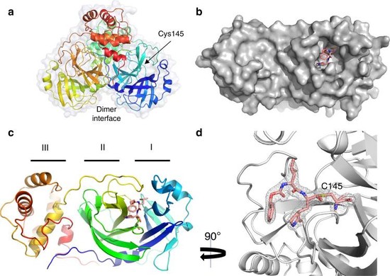 SARS-CoV-2 病毒中的一种主要蛋白酶 Mpro 能够将病毒的多聚蛋白进行切割,是一个重要的潜在药物靶点。GC376 是一种双肽蛋白酶抑制剂,能在纳摩尔级别有效抑制 SARS-CoV-2 的 Mpro。用核磁共振(NMR)分析 GC376 抑制 Mpro 时的晶体结构,结果显示,抑制剂以半硫缩醛形式共价连接到 Mpro 的 Cys145 上。
