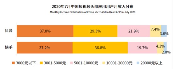 在用户规模和用户收入构成方面,抖音的优势比较明显,不仅用户规模更大,用户构成中高收入人群较多。根据艾媒咨询(iiMedia Research)的数据,目前抖音月收入在10000元以上的用户占比11.0%,而快手为6.3%,差距不小。