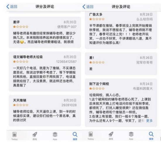“学校组织一起学的课,然后辅导老师在第四节课就会一直给你打电话让你报课,你不报课就会给你禁言,主讲老师讲的很好,但辅导老师有的很不负责任。”一位家长在App Store的一起学网校评论区留言。