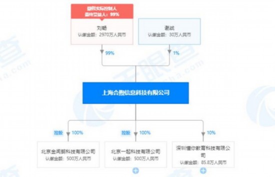天眼查显示,“一起教育科技”创始人兼CEO,是原新东方精英教师刘畅,曾任新东方集团助理副总裁兼沈阳新东方校长,并一手创办长春新东方学校。2011年,刘畅创办一起作业网并担任CEO。一起作业网运营主体为上海合煦信息科技有限公司,法定代表人刘畅持有99%股份,谢战持有1%股份。