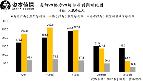 在2018、2019财年,美的和格力归属于上市公司股东净利润均已经超过了200亿元人民币,而海尔智家的净利润仍然在60-70亿元人民币上下徘徊,不及美的、格力的1/3。