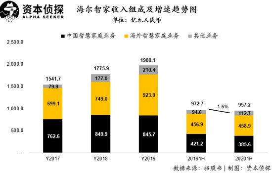 招股书显示,海尔智家2020年上半年取得营业收入957.2亿元人民币,同比下降1.6%;其中海外智慧家庭业务收入为最主要收入来源,为458.9亿元人民币,占比达到47.9%。