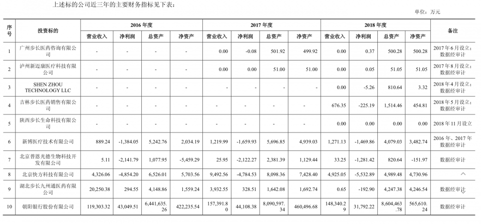 事实上,步长制药长期热衷于对外投资,并且也被监管关注到,在问询函中表示,步长制药股权收购溢价率普遍较高,且部分投资标的财务状况不佳、主营业务与公司原有业务存在较大差异。根据步长制药的回复公告,截至2018年低,步长制药的投资标的大多经营不佳,除朝阳银行外,其余标的或不盈利或出现亏损。